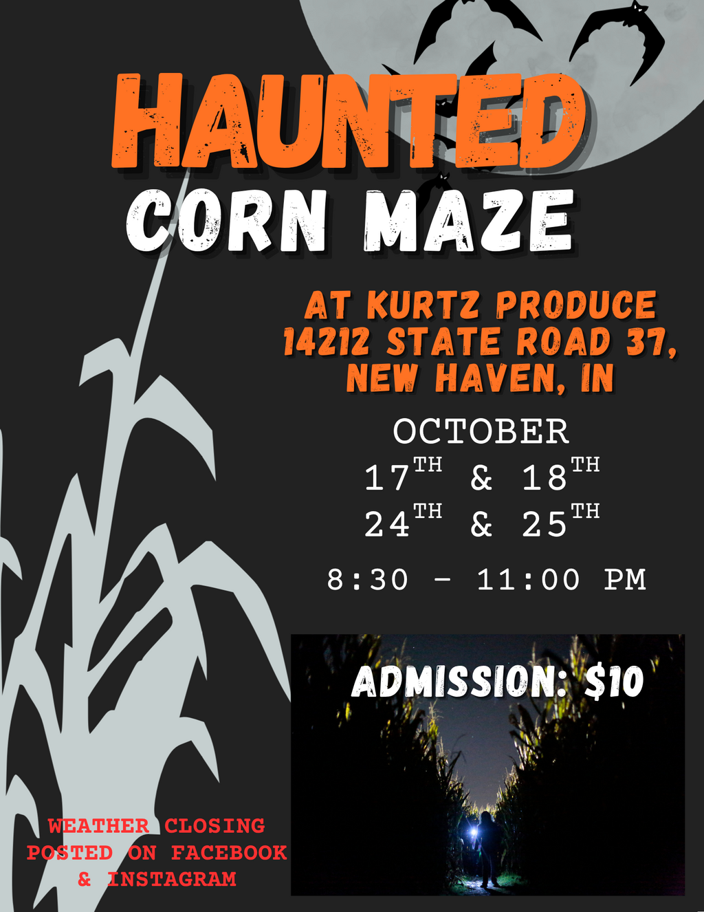 The Corn Maze and U-Pick Pumpkin Patch will open for the season on Friday September 26th and will continue every Friday, Saturday, and Sunday through October. Weather closings will be announced on our Facebook page.